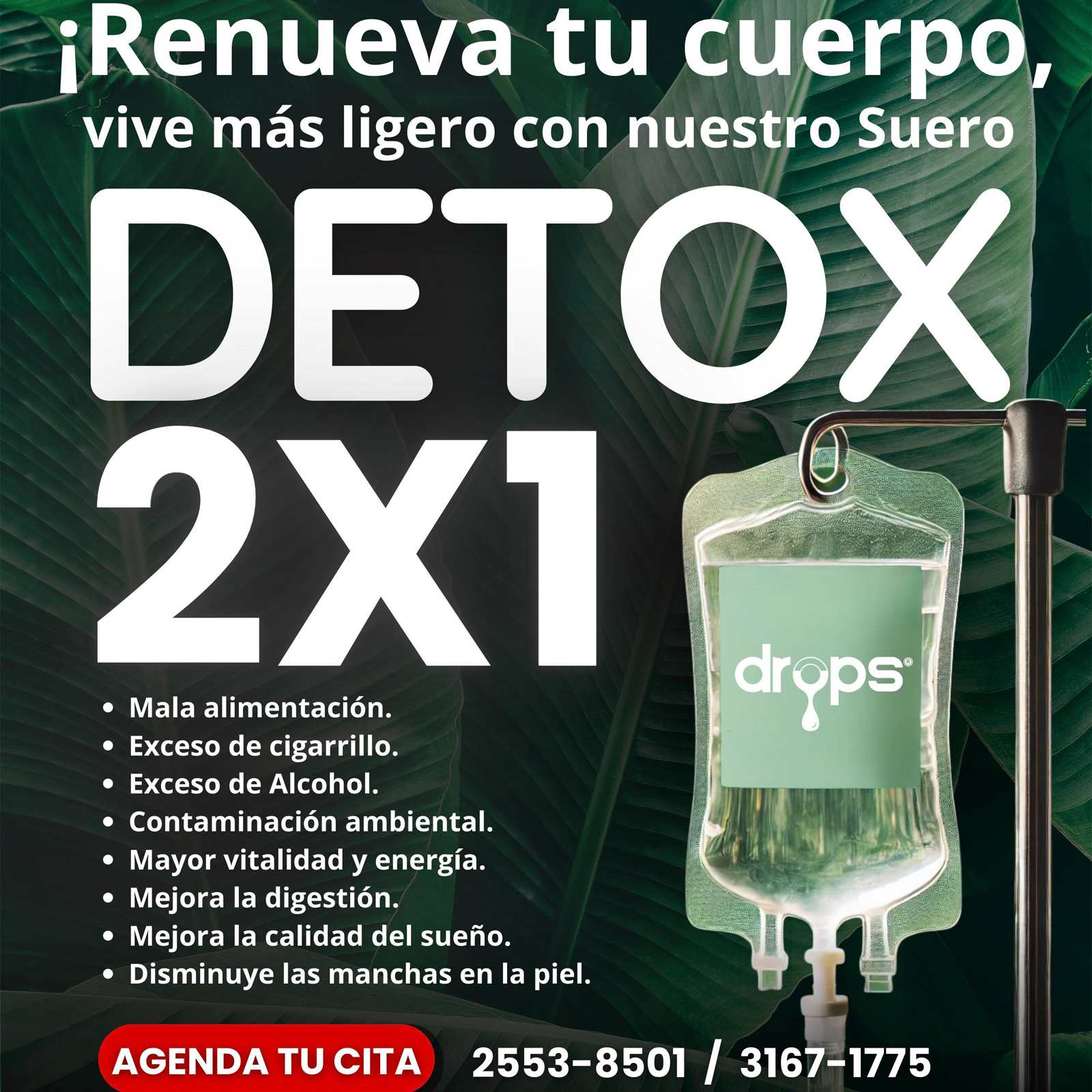 Proporciona reposición de líquidos, electrolitos, vitaminas y antioxidantes para ayudar al cuerpo a reconstruirse y deshacerse de las toxinas no deseadas.