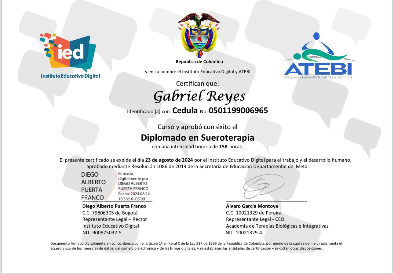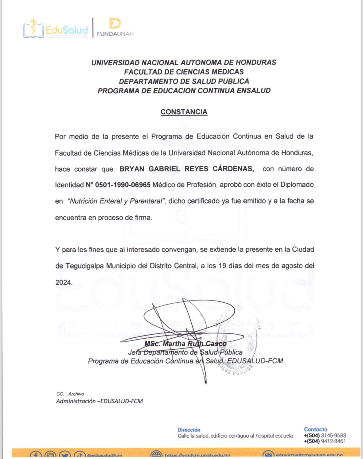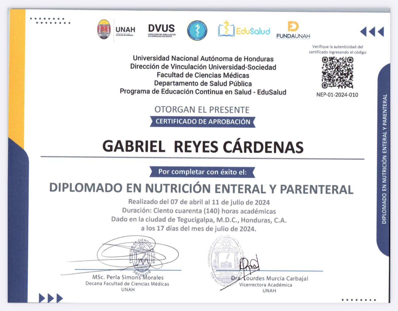 Gabriel Reyes Doctor (current validation) Unicah/TecMon (México)/Enf Cefae (avalado por SESAL) /auxF Cefae (avalado por SESAL) /InstrumenQ/Sueroterapia Issap (México) /medicinapreventiva UNAH /Nutrienteralyparenteral